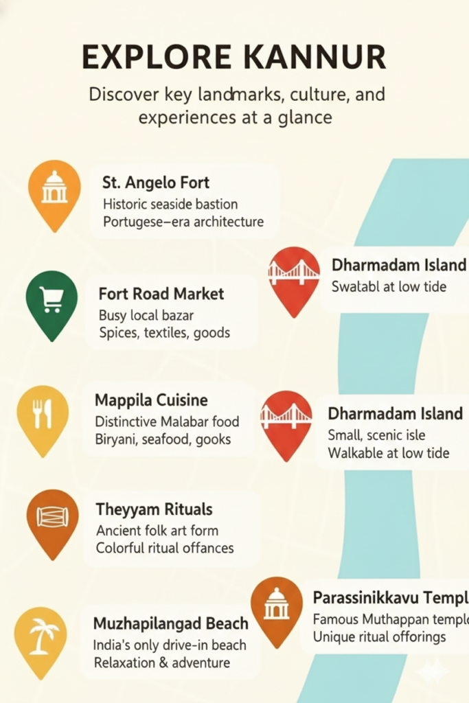 Today, Kannur is a growing educational, commercial, and tourism center. With improved connectivity through Kannur International Airport, the city has emerged as a gateway to North Kerala. Its warm hospitality, traditional cuisine, historical charm, and natural attractions make Kannur a destination that truly reflects the soul of Kerala.